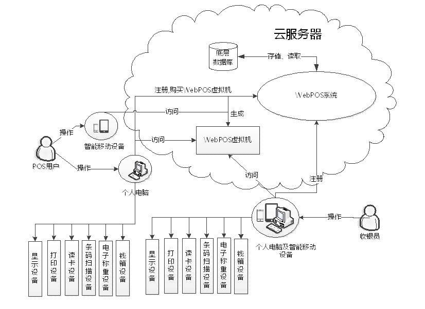 卓安科技WebPOS结构图- 1、采用云服务器以及SaaS(Software as a Service)设计架构,POS用户能够直接从网上注册登录使用WebPOS服务;