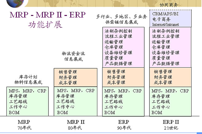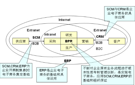 电子商务ERP把传统ERP中的采购、生产、销售、库存管理等物流及资金流模块与电子商务中的网上采购、网上销售、资金支付等模块整合在一起,以电子及电子技术为手段,以商务为核心,打破国家与地区有形无形的壁垒,让企业从传统的注重内部资源管理利用转向注重外部资源管理利用,从企业内的业务集成转向企业间的业务协同。